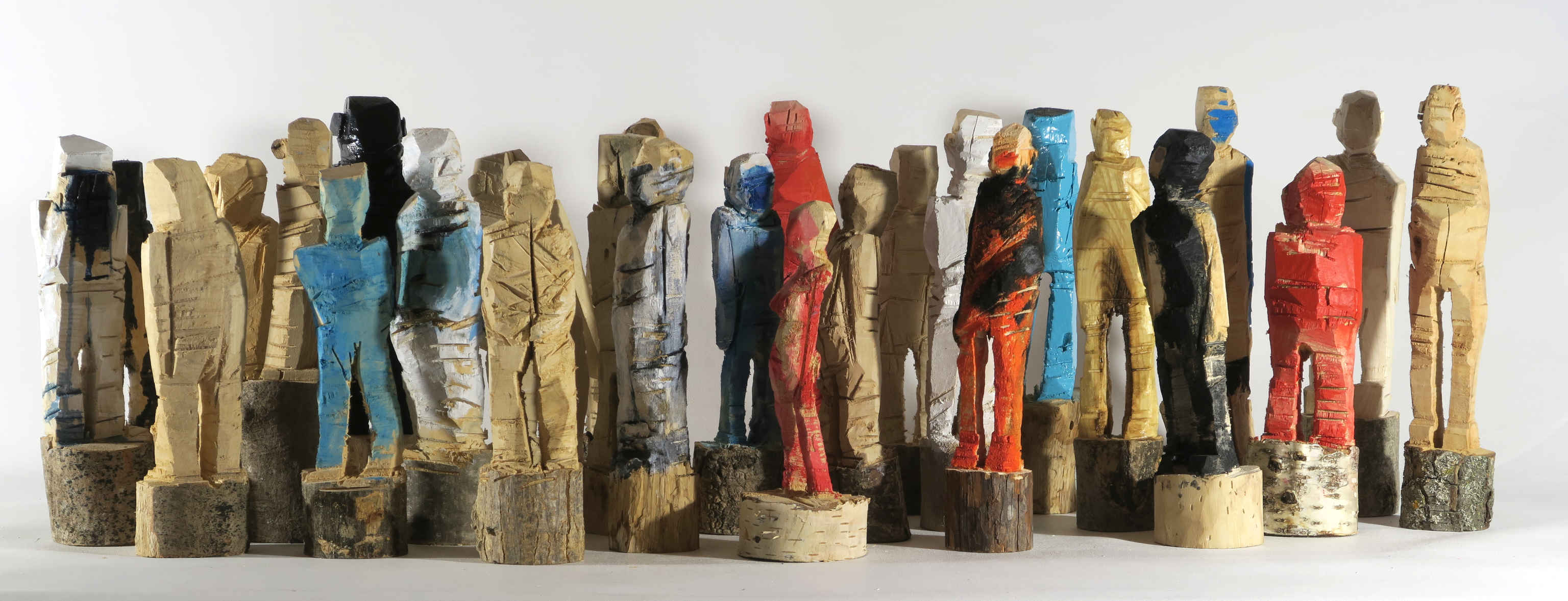 Holzskizzen – kleine Holzfiguren als eigenständige Arbeiten! Die sogenannten Holzskizzen sind kleine Holzfiguren, die in unmittelbarer, freier Arbeit mit der Säbelsäge entstehen. Verwendet werden Äste und Holzstücke unterschiedlicher Herkunft, deren individuelle Struktur, Farbe und Materialität in die jeweilige Figur einfließen. In wenigen, entschiedenen Schnitten formen sich daraus kleine, eigenständige Arbeiten mit jeweils eigener Präsenz. Ursprünglich dienen diese Holzskizzen der gedanklichen und formalen Annäherung an größere Holzskulpturen. Gleichzeitig behaupten sie sich als autonome Werke. Sie sind keine reinen Studien oder Modelle, sondern kleine Holzfiguren, die aus dem Prozess heraus entstehen und als solche bestehen bleiben. Durch die Arbeit mit der Säbelsäge wird die Handschrift der Motorsäge ins Kleine übertragen – mit vergleichbarer Direktheit, Rohheit und körperlicher Spur. Die Entstehung der Holzskizzen folgt keinem festen Plan. Sie entstehen intuitiv, aus dem Moment heraus. Manche bleiben unbearbeitet und roh, andere werden farbig gefasst oder in einzelnen Bereichen weiter verdichtet. Trotz ihres reduzierten Formats besitzen sie eine spürbare Ausdruckskraft und Individualität. Als Unikate aus Holz stehen diese kleinen Figuren für eine konzentrierte Form zeitgenössischer Holzkunst. Sie eröffnen einen unmittelbaren Zugang zur Arbeitsweise und zeigen, wie viel Präsenz und Charakter auch im Kleinen entstehen kann. Jede Holzskizze bleibt offen in ihrer Lesart und lädt zur stillen, persönlichen Auseinandersetzung ein.